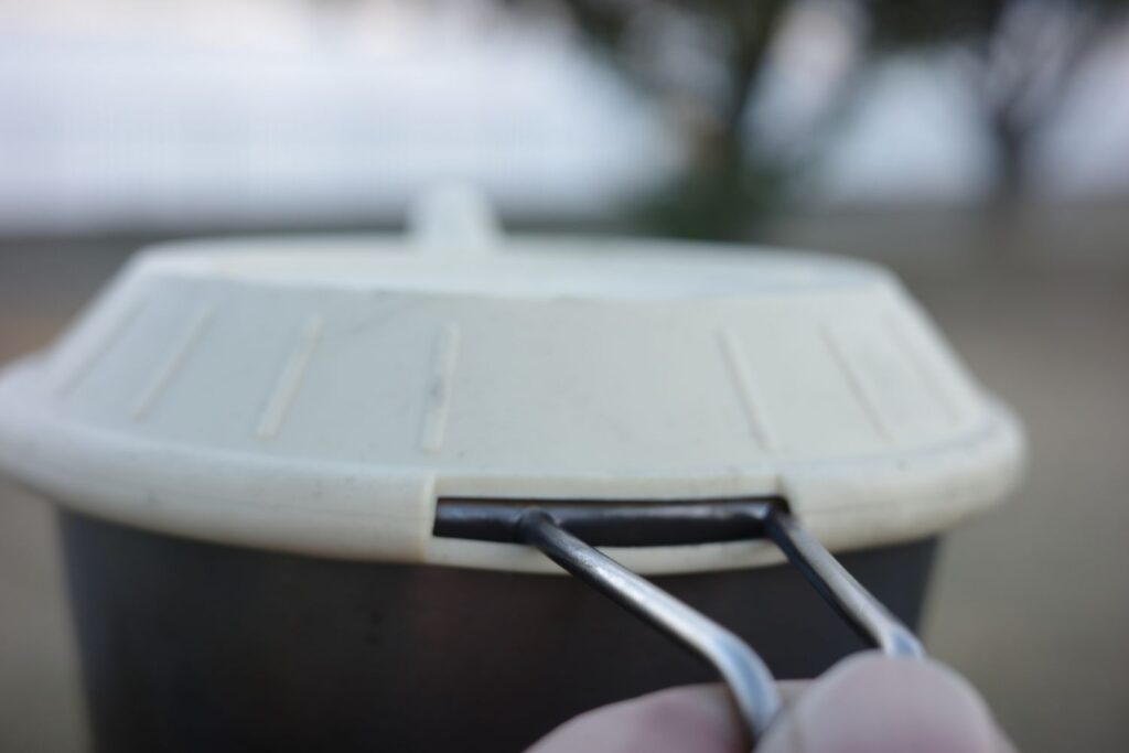 ここからが問題です。キャンピングムーン「シリコンリッド」をシェラカップに装着する必要がありますが、シェラカップ本体が熱いうえにお湯が入っているので結構大変です。